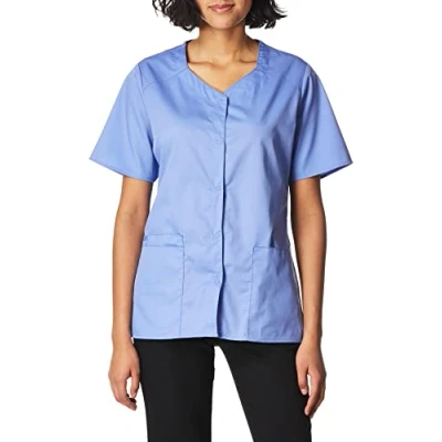 Women's short sleeve snap jacket 360 degree motion stretch flexible fit fabric Two large front patch pockets with pen pocket Easy snap front closure Vented Side Seams at Hem, Bar tacks and Heavy Thread Stitching at Stress Points, Bungee Loop Badge Holder Wearers Right Shoulder