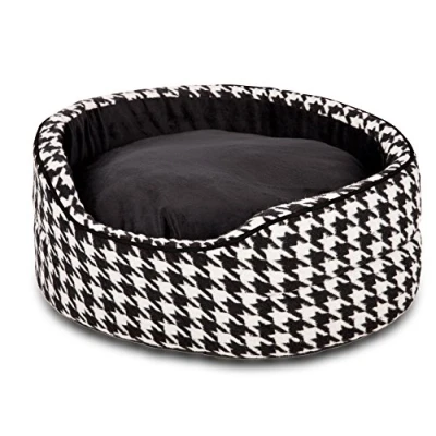 Dog basket comfortable and unique for a deep sleep Houndstooth fabric and black fluffy fabric made from 100% polyester Black satin fabric piping