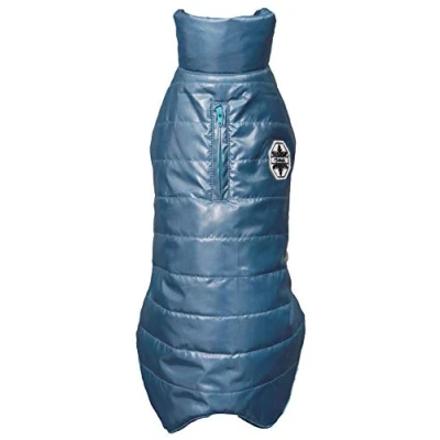 The "blue" jacket is made from 100% polyester. This quilted jacket is lined with a black fleece fabric made from 100% polyester. It is sewn with a beige patch with black embroidery on the lid. Velcro fastener Zip opening on the back to tie your dog