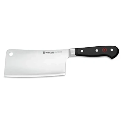 The Wüsthof Classic knife series impresses with its timeless design and reliable performance. It is easy to clean and with its large assortment offers every food fan the ideal cooking tool - e.g. this powerful professional chopping knife for bones and meat The large blade and strong blade meet the highest demands on hardness and strength. So the butcher hatchet is ideal for cutting ribs, chops, bones or even extremely hard-shelled fruit (coconut) - the ultimate tool for chopping The durable blade is forged from one piece of Wüsthof steel and hardened to 58° Rockwell. The small bolster (thickening between blade and handle) reduces weight, so that the large knife sits surprisingly light in the hand A good kitchen knife with non-slip handles made of special plastic. They are triple riveted with stainless steel rivets, joint-less and very hygienic. The ergonomic handle sits comfortably in the hand and supports fatigue-free, safe cutting This all-round stable quality knife from Wüsthof is ideally balanced, supports safe working and is therefore ideal for everyday kitchen work. A brand knife from a real traditional company: Made in Germany – forged in Solingen