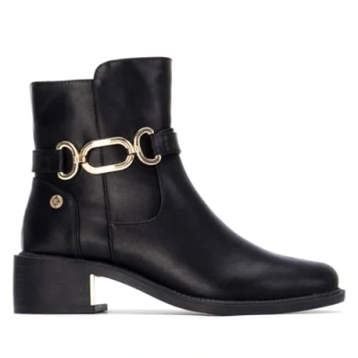 XTI Women's Ankle Boot Made of leather material, with a 16 cm shaft that gives it a sleek and modern design The flat sole, with a small 5 cm heel, offers comfort and stability, while the gold detail on the inside of the heel adds a touch of sophistication. The bootie also features an elegant chain-style detail on the gold-colored side, bringing a touch of luxury and distinction In addition, the inner zip makes it easy to put on and adjust, making this model a practical and versatile option for any occasion. This model has obtained the vegan certificate by the world organization PETA (Animal Rights Organization) [Our Brand]:XTI is characterized by urban and functional fashion with footwear that combines the latest trends with comfort and versatility for an active, modern lifestyle.