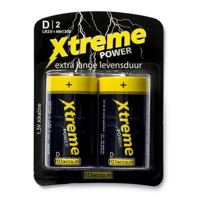 123-3D IEThis package contains two alkaline Xtreme Power D batteries (LR20). The batteries have a voltage of 1.5 volts and are widely used in flashlights and radios. The Xtreme Power batteries last longer than normal batteries. The batteries are not rechargeable.