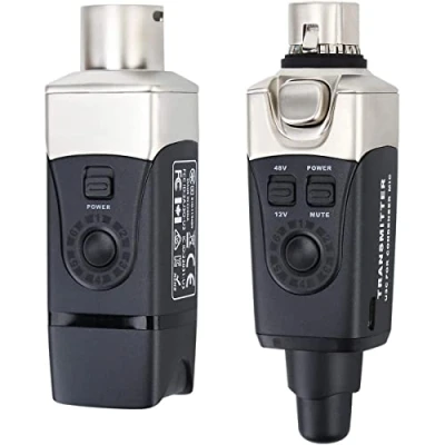 Wireless connection system for condenser microphones Transmitter with XLR input (female) Phantom power switch on transmitter: 12V or 48V. Receiver with XLR output (male) On/off switch on both modules
