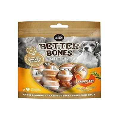 Zeus Better Bones is a new soft dog treat range made with real chicken Combining irresistible, mouth-watering flavours with chewy goodness these dog treats provide hours of fun while satisfying your dogs natural chewing instinct and promoting good oral hygiene no-added salt and easy digestible ingredients rawhide-free which provides a healthy alternative for dogs