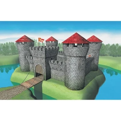 Plastic model kit of a medieval fortress with 200 pieces and metal chains. The fortress consists of 4 round towers with roof and a square tower with drawbridge and grid. The towers are connected by 9 wall segments. Built 275 x 200 x 200 mm., Manufacturer: Zvezda LLC